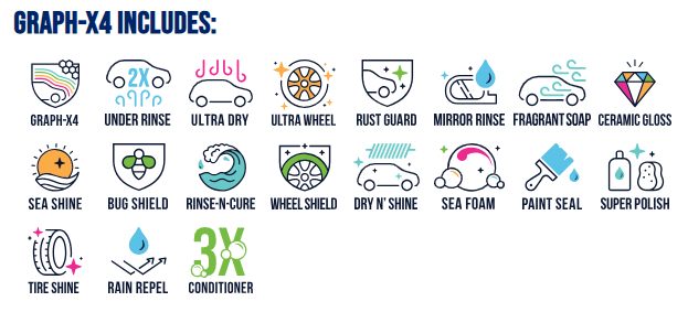 The Tidal Wave Graph-X4 ® is most advanced wash that helps protect your car from dirt and UV rays with a powerful four-layer shield that includes our legendary Ceramic Sea Gloss and Graphene Oxide to give your car space age sparkle and powerful protection.