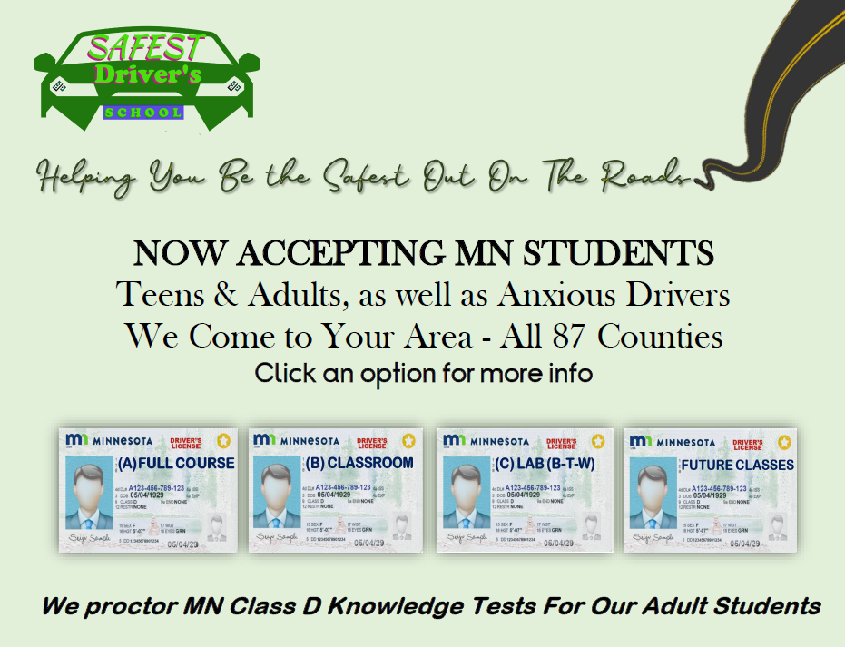 We at Safest Driver's School exist to teach dedicated teen and adult students across Minnesota, the MN Class D Knowledge and Behind-the-Wheel materials, to develop courteous, responsible, defensive, and safe driving behaviors and habits. Our mission, along with study resources and guides, focused encouragement and support, and LOTS of practice helps each unique student retain the information and overcome nervousness and/or anxiety roadblocks. This philosophy ensures that students will have the knowledge, skills, and confidence to pass the required tests to go on to make positive impacts on the traveling public as the Safest Driver's on the roads.